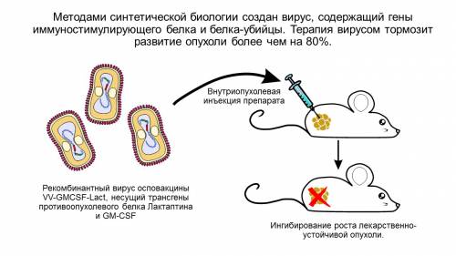 «Этот вирус обладает собственным онколитическим потенциалом, то есть способен уничтожать раковые клетки, — рассказал Владимир Рихтер. — Однако для эффективного лечения опухолей собственного потенциала вирусов в основной массе недостаточно, хотя известен даже такой парадоксальный случай, когда онкологический пациент выздоровел после того, как перенес грипп. Мы увеличили противоопухолевую эффективность вируса, встроив в его геном два гена, кодирующие: а) белок-убийцу лактаптин и б) GMCSF, стимулирующий местный иммунный ответ. Причем встроили эти гены в участки генома вируса, ответственные за его размножение: ген вирусной тимидинкиназы и ген вирусного ростового фактора. Таким образом, — заключил В. Рихтер, — нам удалось почти полностью подавить способность вируса размножаться в здоровых клетках, зато примерно в 200 раз, по сравнению с исходным vaccinia, повысить интенсивность размножения в опухолевых».